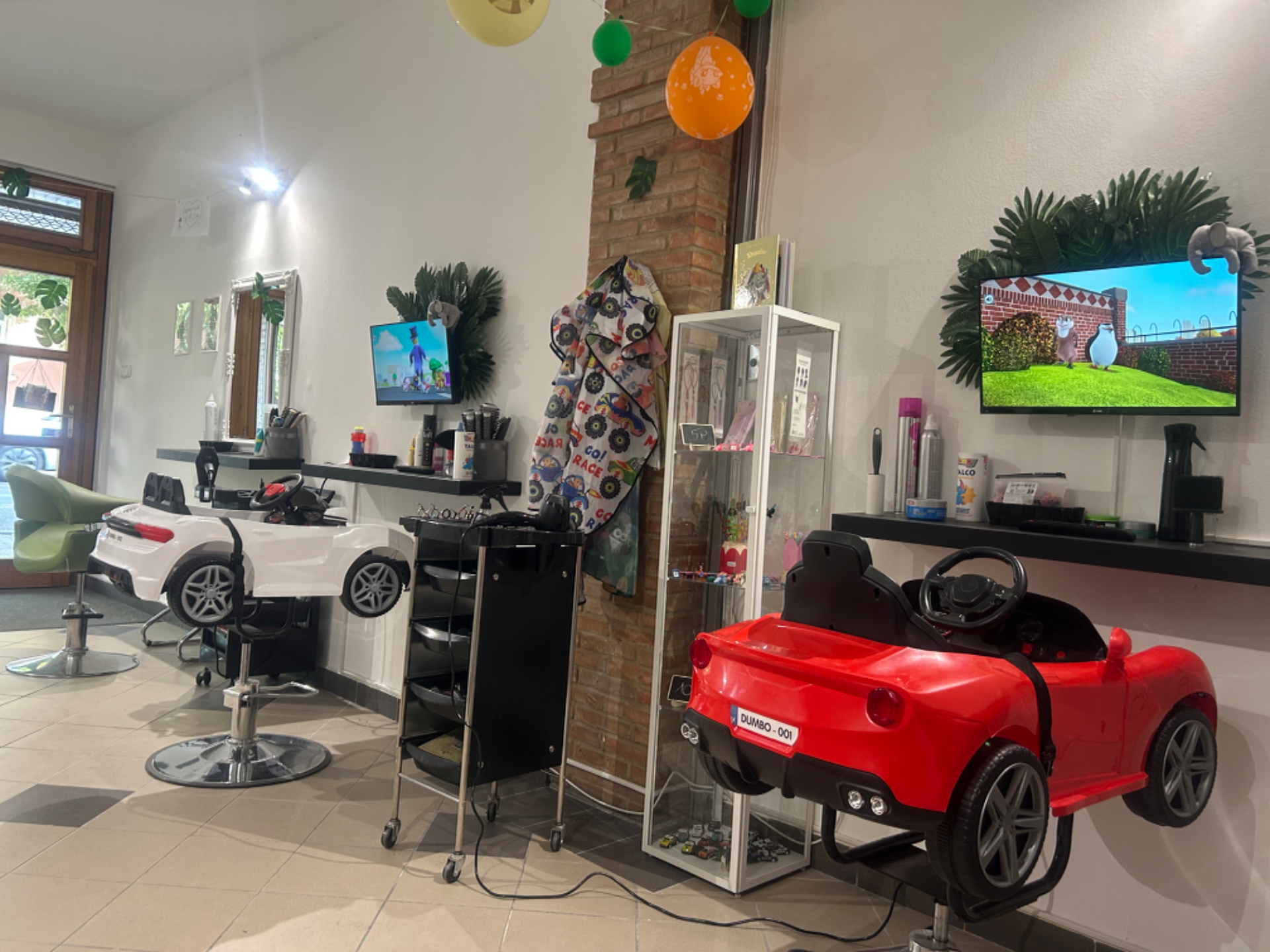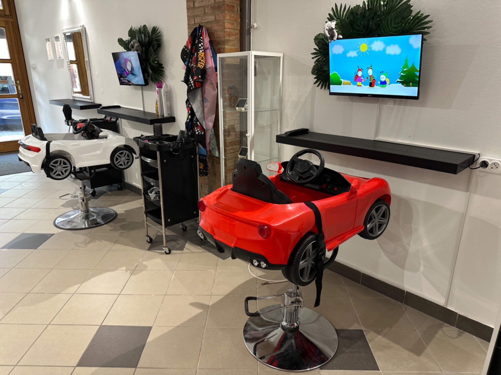 A Dumbo Gyermekfodrászatban piros és fehér versenyautók várják a kis sofőröket, miközben kedvenc meséik mennek a tévén!